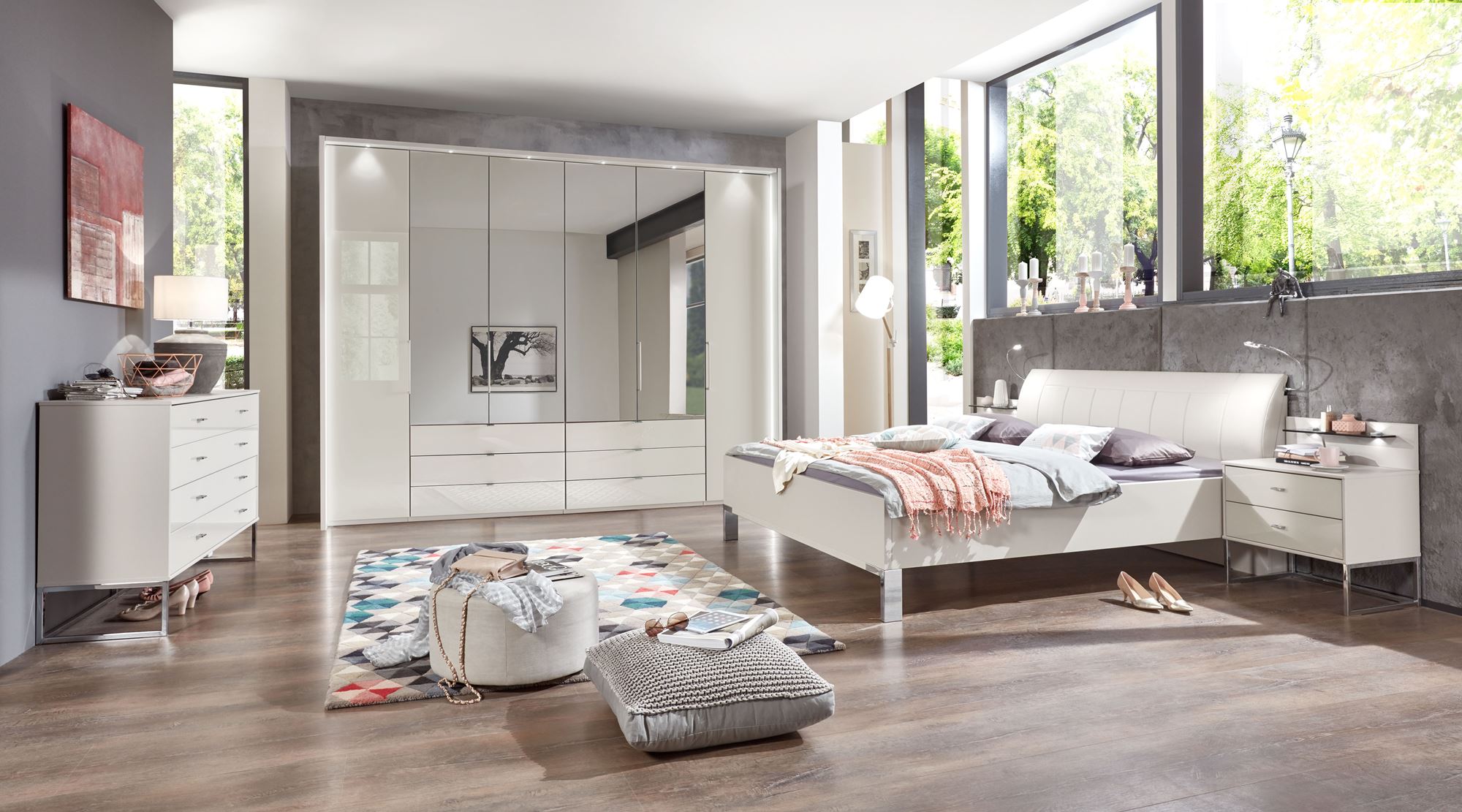 Luxusní ložnicová sestava Kansas na první pohled zaujme elegantním a vzdušným designem, který oživí každý moderní interiér. K výrobě bylo použito vysoce kvalitní lamino v příjemném odstínu bílá champagne, které vkusně doplňují lesklé plochy s tvrzeného skla ve stejném odstínu. Elegantní design nábytku podtrhují chromované rukojeti a nohy. Na výběr máte z několik druhů skříní v různých velikostech, komody, postele ve standardních i prodloužených variantách a noční stolky.
